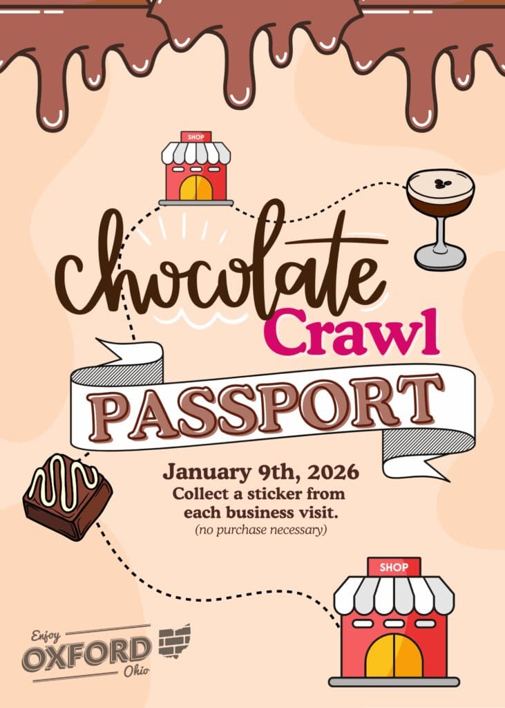 Grab your friends and family to visit each participating Oxford business for tasty treats and more to complete the Chocolate Crawl. Pick up a passport at any of the participating businesses in the 2026 Chocolate Crawl, plan your route, and collect stickers to mark your completed stop for a chance to win a prize! *purchase not required but appreciated