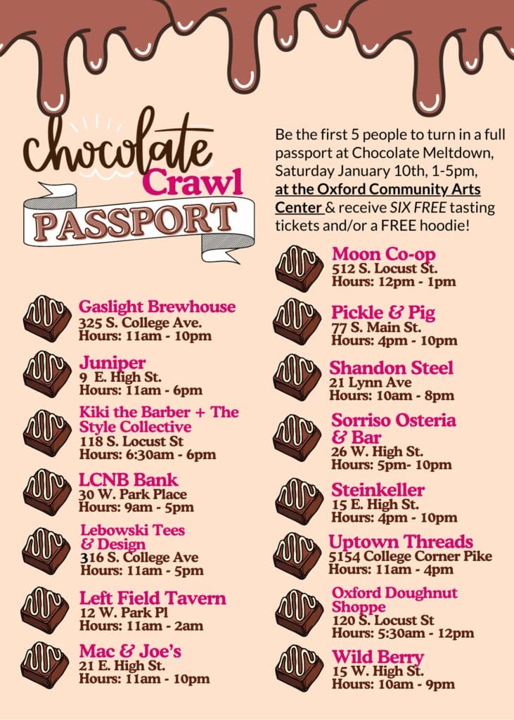 THE PRIZE? Be the first to turn in a full passport at Chocolate Meltdown to the Main Office of the Oxford Community Arts Center & receive SIX FREE tasting tickets at Chocolate Meltdown, plus a FREE hoodie! The next four people to submit a full passport will win a FREE Chocolate Crawl hoodie.